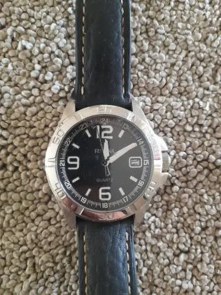 Reloj de pulsera con correa de cuero negra y detalles plateados. En excelente estado - Correa de cuero con costuras blancas. - Esfera negra con números y manecillas plateadas. - Hebilla metálica plateada.