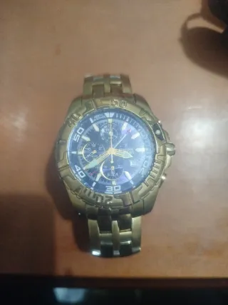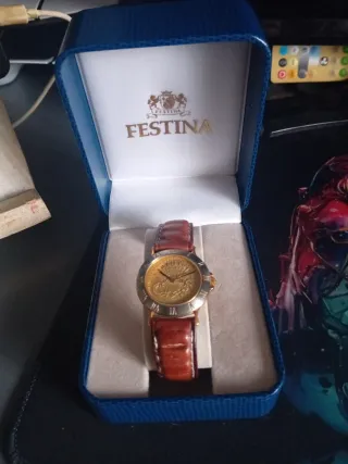 Elegante reloj de pulsera Festina con una combinación de colores dorados y negros. -Esta nuevo lo he usado solo una vez,tiene factura y eslabones - Diseño clásico y sofisticado. - Correa de eslabones metálicos. - Esfera redonda con detalles en dorado. -Precio poco negociable urge venta