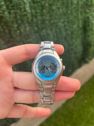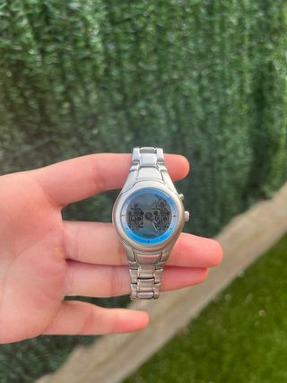 Reloj Fossil Big Tic JR-8197 con detalles en azul y plateado. - Animaciones de “stickmans” - Modelo raro. - Diseño moderno y llamativo. - Correa metálica ajustable. - Bien conservado, actualmente sin pila, se le añadiría sin coste adicional en el momento de la compra. - La pulsera es un poco pequeña.