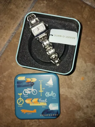 Elegante reloj de pulsera para mujer con un diseño sofisticado. - Caja rectangular con detalles brillantes. - Correa de eslabones metálicos. Reloj de pulsera sencillo pero elegante de Fossil. Con incrustaciones a los lados de la esfera rectangular. Pilas recién cambiadas. El precio se negocia en la app, no presencialmente. Puedes venir a valorarlo si quieres en persona y decidir si lo compras o no.