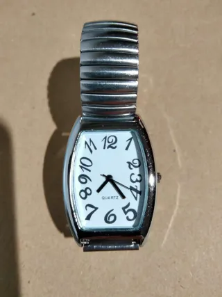 Elegante reloj de pulsera con un diseño clásico y números grandes para una fácil lectura. - Correa extensible plateada. - Esfera blanca con números negros. - Movimiento de cuarzo.