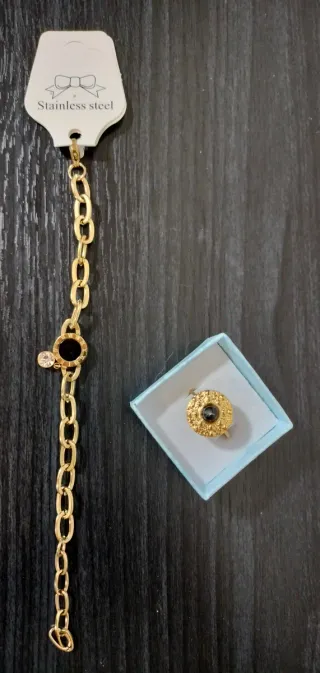 Pulsera eslabones grandes y anillo piedra negra