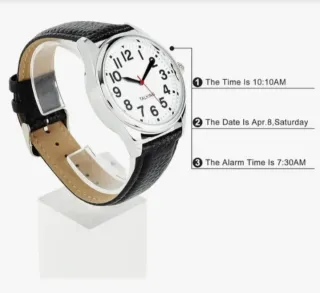 Reloj de pulsera con correa de cuero negra y detalles plateados. - Esfera blanca con números grandes. - Correa de cuero. - Cierre de hebilla.