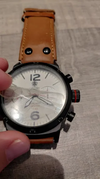 Reloj de pulsera con correa de cuero y esfera blanca. - Esfera con números grandes y subesferas. - Correa de cuero marrón. - Bisel negro. - Va con el protector de pantalla