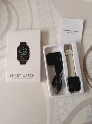 Reloj inteligente con pantalla grande y pulsera para monitorizar el ritmo cardíaco. Incluye cargador. - Caja del reloj en color negro. - Pulsera en color beige. - Cargador magnético.