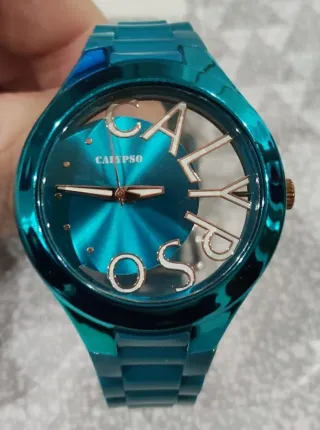 Elegante reloj Calypso para mujer con un llamativo diseño. - Pulsera y caja en tono teal brillante. - Detalles en dorado en la esfera y la corona. - Esfera con diseño moderno y números grandes.