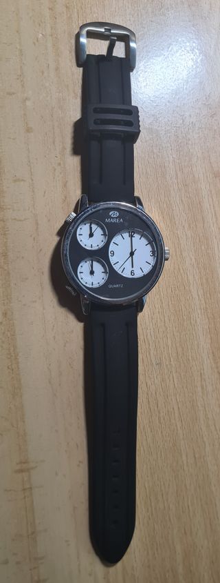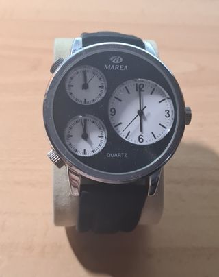 Reloj de pulsera de la marca Marea con un diseño llamativo. - Esfera principal grande. - Tres subesferas adicionales. - Correa de color negra. - Detalles plateados en la caja.