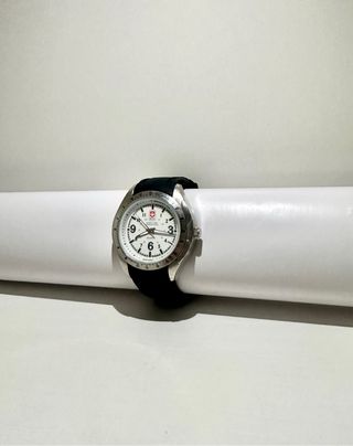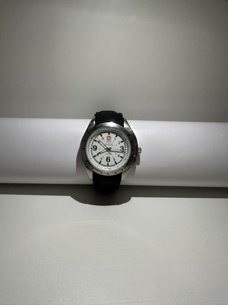 Elegante reloj de pulsera con un diseño inspirado en la estética militar. Su esfera blanca y detalles plateados le dan un toque sofisticado. Vendo reloj tipo militar / estilo "Swiss Military" en perfecto estado, nunca usado (sin caja original). Ideal para uso diario o como accesorio estiloso para hombre/mujer. Características principales: V Movimiento QUARTZ (cuarzo) - preciso y fiable v Bisel con taquímetro (Tachymeter) V Esfera clara con números arábigos grandes (fácil lectura) V Logo estilo suizo con cruz roja (estética militar) V Agujas luminosas o destacadas (según iluminación) Correa de goma/plástico negra - cómoda y resisten