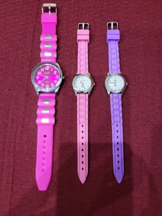 Conjunto de tres relojes de pulsera con correas de silicona. - Correa de silicona rosa fucsia con detalles plateados. Esfera plateada grande con fondo rosa fucsia. - Correa de silicona rosa claro. Esfera plateada con brillantitos. Números en rosa. Segundero decorado con un corazón. Tiene el plástico protector tanto en el cristal como en la tapeta. - Correa de silicona morada. Esfera plateada con brillantitos. Números en morado. Segundero decorado con un corazón. Tiene el plástico protector tanto en el cristal como en la tapeta. Los tres están sin usar. 3€ cada uno.