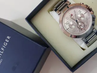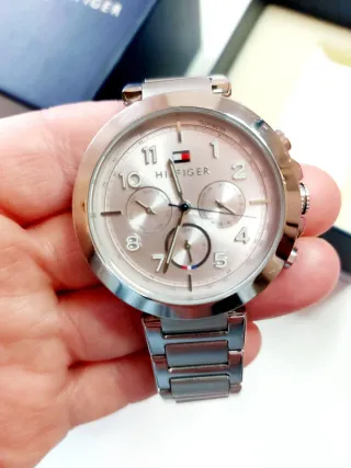 Elegante reloj de pulsera para mujer de Tommy Hilfiger. - Esfera en tono rosa pálido. - Detalles en plateado. - Correa de eslabones metálicos, se le quitó un eslabón porque me quedaba grande, pero entrego el eslabón, por lo que puede volver a ajustarse sin problema. Pila recién puesta, funciona perfectamente.