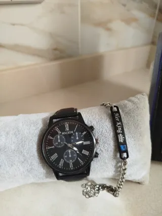 ¡Se escuchan ofertas! ¡Estilo moderno y masculino! Pongo a la venta este exclusivo pack de accesorios que combina un diseño deportivo con un toque espiritual y rústico. Ideal para uso diario o como regalo original. Características del Pack: Reloj Shaarms: Esfera negra con números grandes en contraste naranja, muy fácil de leer. Correa: Silicona o cuero sintético negro mate, muy resistente y cómoda. Set de Pulseras: Varias tiras de cuero trenzado con un amuleto central del "Árbol de la Vida" en color plata vieja. Estado: Nuevo/Impecable. El reloj conserva su brillo original y las pulseras están perfectas.