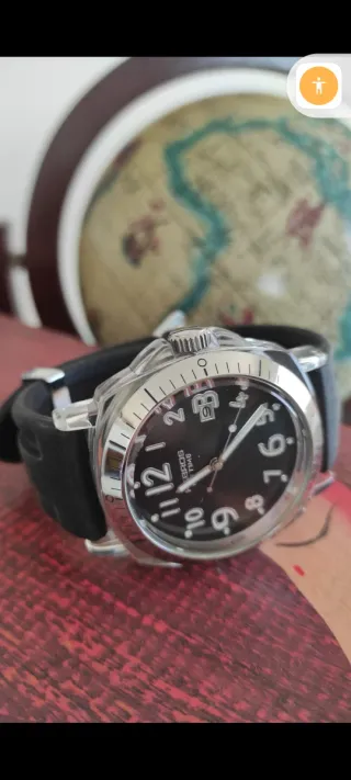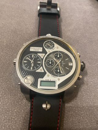 Reloj Diesel de 57mm con un diseño muy elegante en su dia el reloj de pulsera mas grande del mercado. - Esfera con 4 diales tres analógicos y uno digital . - Correa de cuero negra con pespuntes rojos. - Bisel plateado. -No tiene pila y lleva 4 una para cada reloj. -Se guardó funcionando esta en buen estado -Me costo 400€