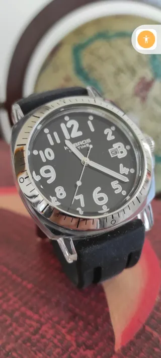 Reloj de pulsera con correa de cuero negra y detalles plateados.Sin pilas.Me costò 199 euros - Esfera negra muy grande,con números arábigos. - Correa de cuero. - Cierre de hebilla.