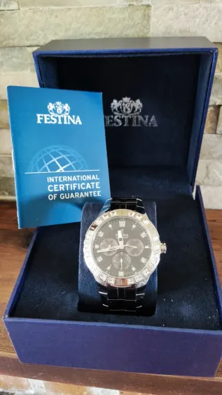 Reloj de pulsera Festina con caja original y certificado de garantía internacional. - Brazalete de eslabon de acero para ampliar y hacerlo mas grande. - Esfera con detalles en plateado y negro. Usado únicamente el día de la comunión. Siempre guardado en caja y en cajón.