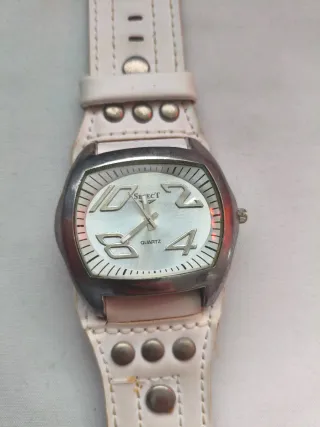 Elegante reloj de pulsera con correa blanca y detalles plateados. - Diseño de caja rectangular. - Correa de cuero sintético. - Esfera con números y un pequeño dial secundario para el dia. - Bisel grande Reloj reparado funciona preferentemente