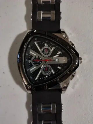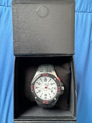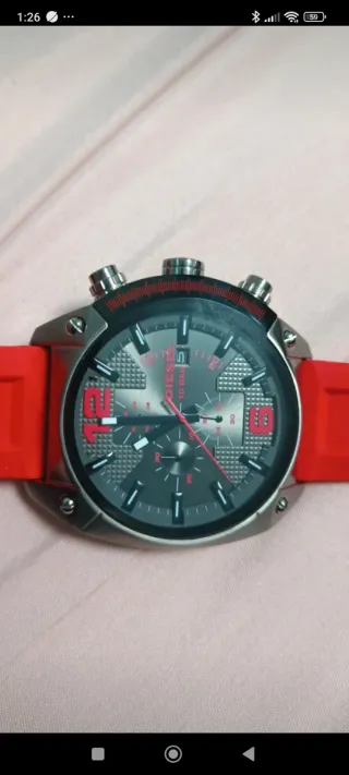 Reloj de pulsera con correa de silicona roja y detalles plateados. Como nuevo usado 3 dia Sin arañazos caja 45-48mm - Esfera gris con marcadores horarios plateados. - Bisel con detalles en rojo. - Correa de silicona roja.