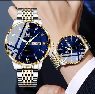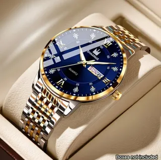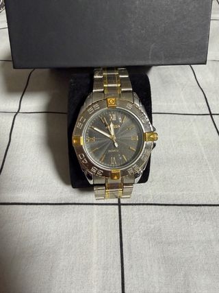 Elegante reloj de pulsera con un diseño sofisticado. - Esfera de color azul profundo. - Detalles y bisel en tono dorado. - Correa de eslabones combinada en plata y oro. - Indicador de día y fecha.