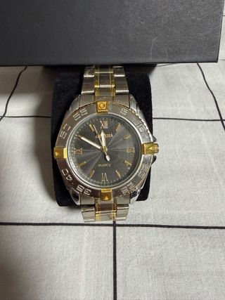 Reloj de pulsera con detalles en oro y plata. - Esfera negra con detalles dorados. - Correa de eslabones. - Bisel con marcadores.