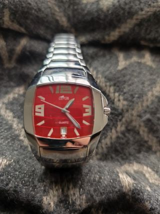 Elegante reloj de pulsera de la marca Lotus con un diseño moderno y llamativo. - Esfera de color rojo vibrante. - Correa y caja de metal plateado. - Detalle de fecha en la esfera. - Solo le hace falta ponerle una pila.