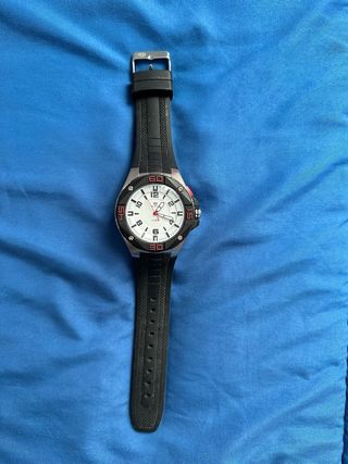 Reloj de pulsera para hombre con un diseño moderno y deportivo. - Correa de caucho negra. - Caja de acero inoxidable plateada. - Esfera blanca con detalles en rojo. - Cierre de hebilla. 10 ATM