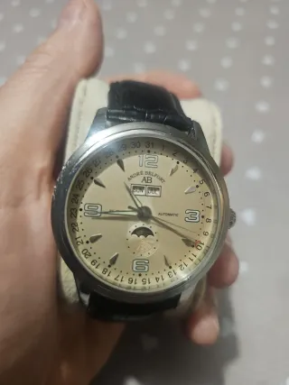 Elegante reloj de pulsera para hombre de la marca Andre Belfort. Presenta una esfera con detalles y un diseño clásico. - Correa de piel negra. - Caja de acero plateada. - Indicador de fase lunar. - Correa con cierre de hebilla.