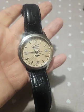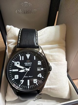 Reloj de pulsera Orient con correa de cuero negra y esfera negra. - Movimiento automático. - Resistente al agua (Water Resist). - Correa de cuero con costuras blancas. - Caja de reloj con logo Orient grabado. Como se puede ver en la foto tiene algo rayado la tapa interior y en correa unas mini mancha por lo demás impecable. Con caja y embalaje original.