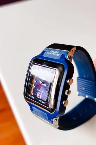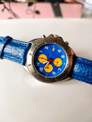 Reloj de pulsera para hombre con un diseño deportivo y llamativo. - Esfera azul con detalles amarillos. - Correa de cuero azul. - Bisel plateado con números. - Resistente al agua.
