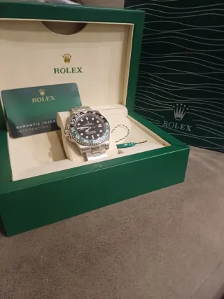 Reloj de pulsera con esfera negra y bisel bicolor verde y negro. - Bisel giratorio bidireccional de 24 horas. - Ventana de fecha con lente Cyclops. - Brazalete Oyster de acero inoxidable. -entrega en mano -envíos fuera de plataforma