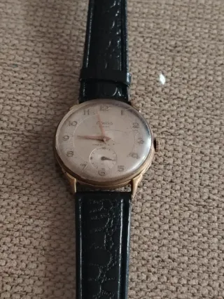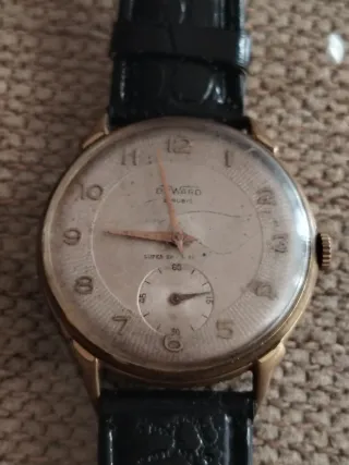 Reloj de pulsera Duward para hombre, con un diseño clásico y elegante. - Esfera con detalles dorados. - Correa de piel negra con textura. - Caja chapada oro de 10 kilates. - 21 Jewels. - Fabricado en Suiza en las décadas de los 50 o 60. - Sistema Super Shock. - Agujas tipo Dauphine o de lanza. - Su caja mide 3,6 cm sin corona.