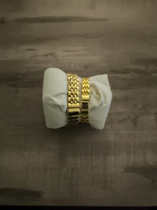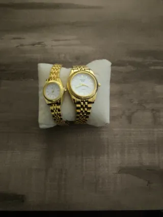 Conjunto de dos relojes de pulsera de hombre y de mujer. Diseño elegante en tono dorado. Esferas blancas. De acero inoxidable. Nuevo a estrenar.