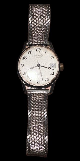 Reloj de pulsera HERMO SUISSE de acero. - Esfera blanca con números arábigos. - Cuerda - -Ventana de fecha. - Correa de malla metálica de acero inoxidable. - 17 rubíes sintéticos (jewels). - Sistema Incabloc. - Vintage (Años 70-80) -Hombre -Funcionando. -Un clásico para tu colección.