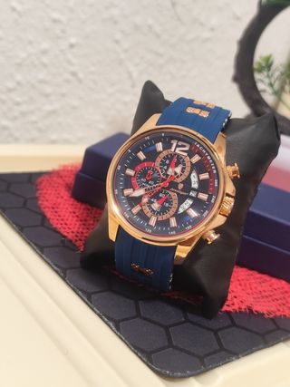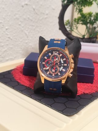 Reloj de pulsera con correa de silicona azul y detalles dorados. - Esfera azul con detalles en rojo y dorado. - Bisel con taquímetro. - Tres subesferas en la esfera principal.