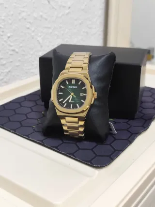 Elegante reloj de pulsera con un diseño moderno y llamativo. - Esfera de color verde vibrante. - Detalles en tono dorado. - Brazalete combinado en plateado y dorado.