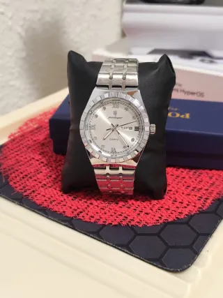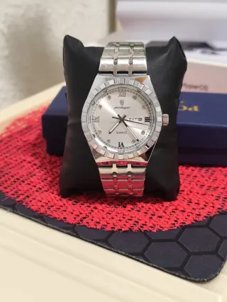 Reloj de pulsera con un diseño moderno y elegante. - Bisel con detalles en rojo y azul. - Correa de eslabones plateada. - Esfera azul con marcadores horarios plateados. - Ventana de fecha. - Resistente al agua 30M.