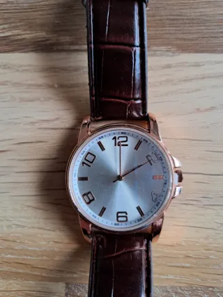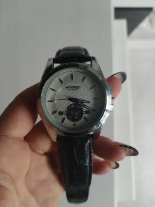 Elegante reloj de pulsera para hombre con correa de cuero. - Esfera plateada con detalles. - Correa de cuero negra con textura. - Hebilla metálica plateada. Le falta el botón de cambiar la hora por lo demás está perfecto