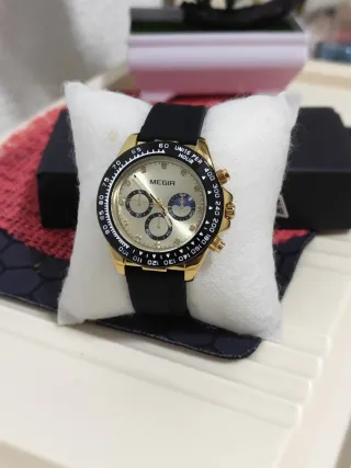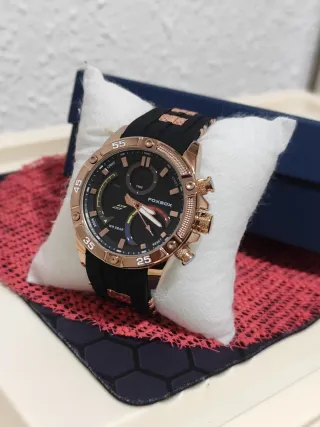 Reloj de pulsera con un diseño moderno y elegante. - Correa de silicona negra. - Detalles en tono dorado en la caja y bisel. - Esfera con múltiples indicadores.