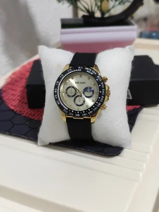 Elegante reloj de pulsera con un llamativo diseño. - Esfera con detalles dorados. - Correa resistente y cómoda. - Bisel con diseño deportivo.