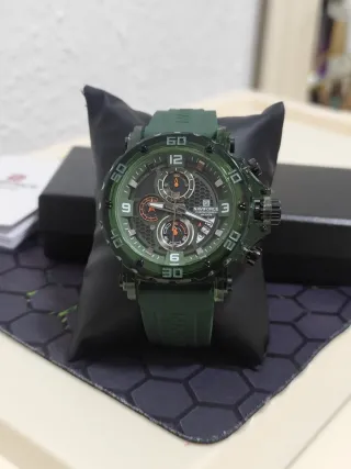 Elegante reloj de pulsera para hombre con un diseño moderno y sofisticado. - Esfera de color verde con detalles plateados. - Correa de metal en tono plateado. - Resistente al agua.