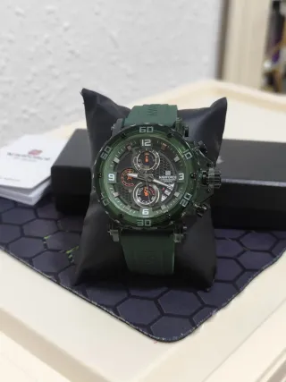 Reloj de pulsera para hombre con un diseño deportivo y moderno. - Correa de silicona en tono verde. - Esfera con detalles en naranja y blanco. - Bisel con marcadores de tiempo.