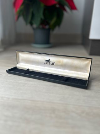 Caja original Lotus alargada, válida para reloj fino o pulsera. Presenta marcas de uso en el exterior y manchas/amarilleo en el interior visibles en las fotos, propias del paso del tiempo. La caja abre y cierra correctamente. Se vende solo la caja, sin reloj ni pulsera. Precio ajustado al estado.