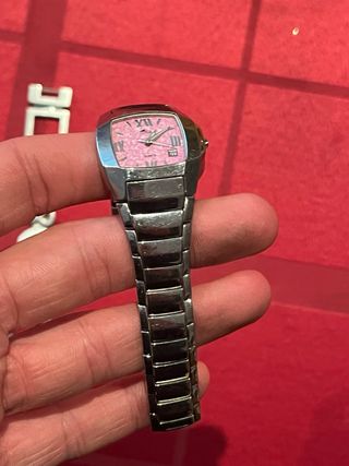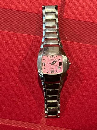 Reloj de pulsera de la marca Lotus. - Esfera en tono rosa pálido y pulsera acero inoxidable. - Viene con pila. - Viene con más cadena para agrandar. - No sumergible. - Da hora y día.