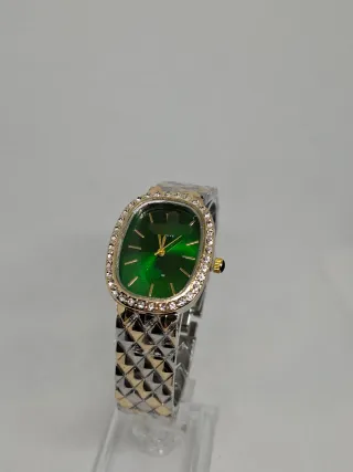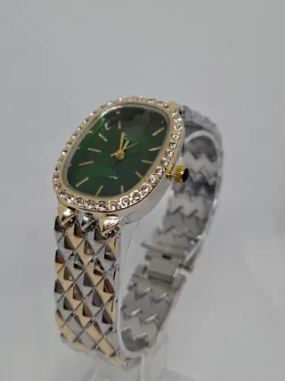 Elegante reloj para mujer con un diseño ovalado y detalles brillantes. - Bisel adornado con pedrería. - Esfera de color verde intenso. - Pulsera combinada en tonos dorados y plateados. - Diseño de la pulsera con relieve.