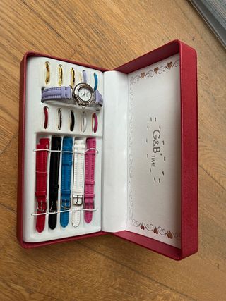 Es un reloj de pulsera al que le puedes cambiar la correa y el circulito del reloj para tener un reloj que te pegue con todo. Contiene 6 correas de distintos colores, el reloj para enganchar las correas y 11 “argollas” para el reloj