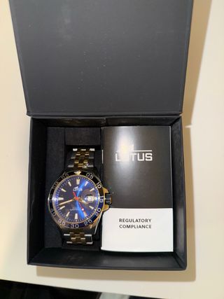 Imponente reloj de pulsera Lotus de Hombre, de gran tamaño (caja ancha y maciza), 4'5x1cm la esfera, funciona perfectamente, la caja tiene una pequeña tara en uno de los lados traseros, una bisagra, pero está en perfectas condiciones (mirar fotos), si eres un manitas seguro lo arreglas sin esfuerzo. Encontré la caja y la añado al pack sin subir el precio, aunque escucho ofertas. Años 2000.