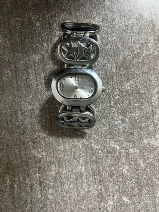 Elegante reloj de pulsera con un diseño único. - Brazalete con eslabones ovalados y detalles de estrellas y luna. - Esfera ovalada plateada. - Cierre de hebilla.