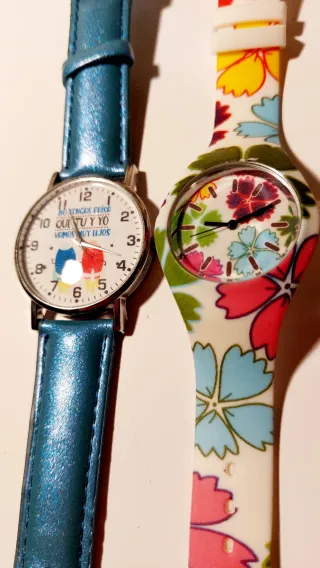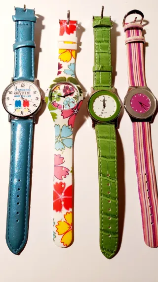 Conjunto de cuatro relojes de pulsera con diseños variados. - Reloj con correa azul. - Reloj con correa estampada de flores. - Reloj con correa verde texturizada. - Reloj con correa de rayas multicolores. No tienen pila Este artículo ha sido donado a la Asociación Protectora de animales SOS Bilbao para su venta solidaria. Con lo recaudado se colabora para cubrir los gastos derivados del cuidado de los animales rescatados por esta Asociación.