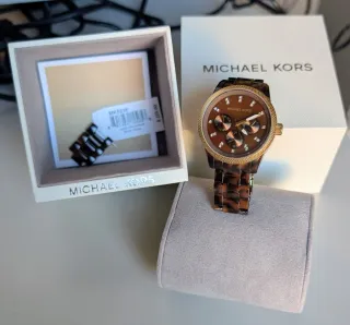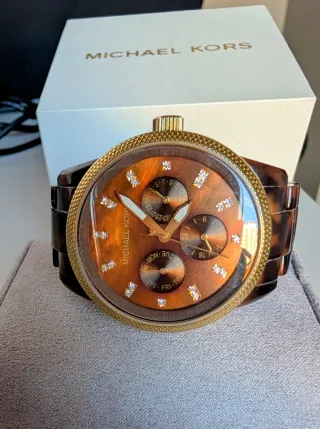 Elegante reloj Michael Kors con un diseño inspirado en la concha de tortuga - Esfera con detalles en dorado. - Pulsera con acabado carey - Movimiento de cuarzo con calendario day date y 24 h - Recién revisado y batería cambiada Diciembre `25 - Caja original, etiqueta y eslabones de repuesto