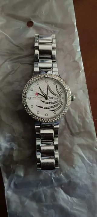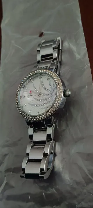 Elegante reloj de pulsera con un diseño clásico y sofisticado. - Brazalete de eslabones plateados. - Esfera redonda con detalles brillantes. - Cierre de seguridad.