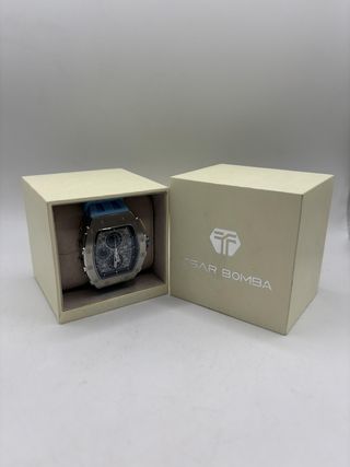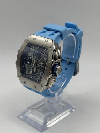 Reloj ligero con correa flexible transparente de color azul Diámetro: 36 Nuevo sin estrenar (tiene puesto el protector del cristal) Funciones: hora, fecha, alarma. No funciona la luz. Resistente al agua.