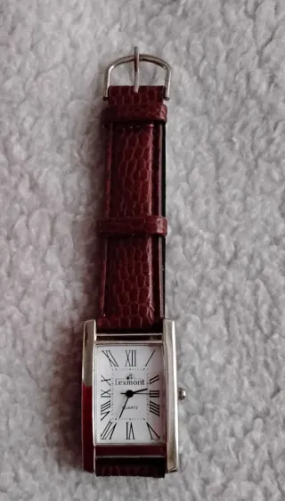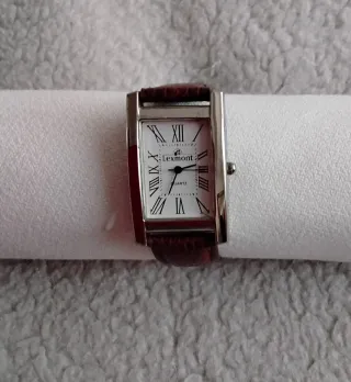 Elegante reloj de pulsera con correa de piel. - Esfera rectangular con números romanos. - Correa de piel con textura. - Detalles en tono plateado.